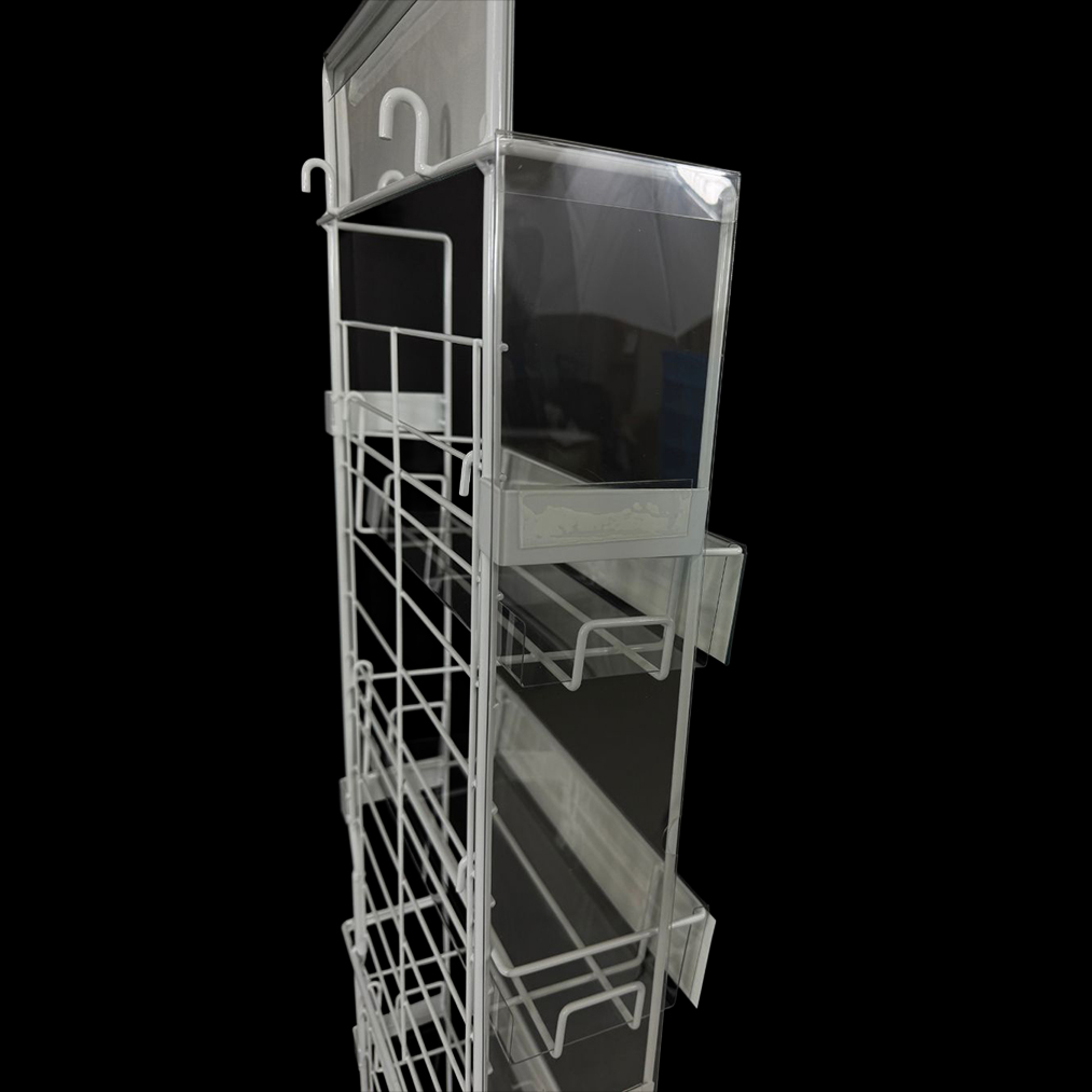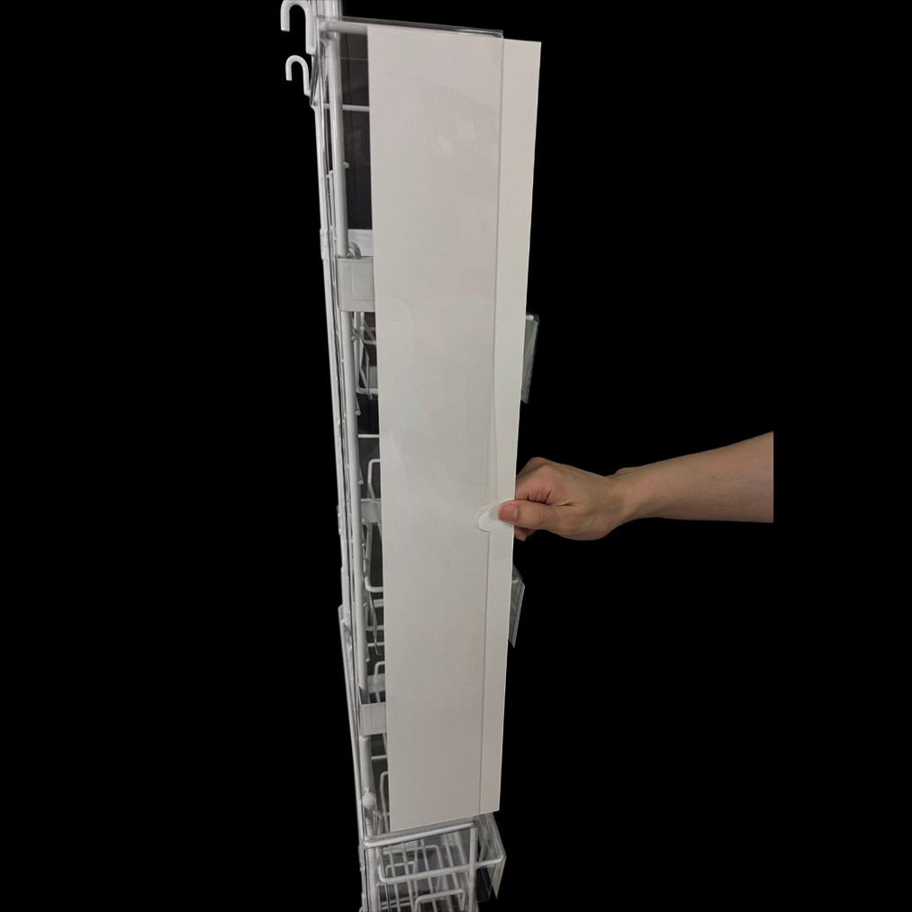 エンドサイド什器の上部に引っ掛けられるPOPを入れるためのケースです。