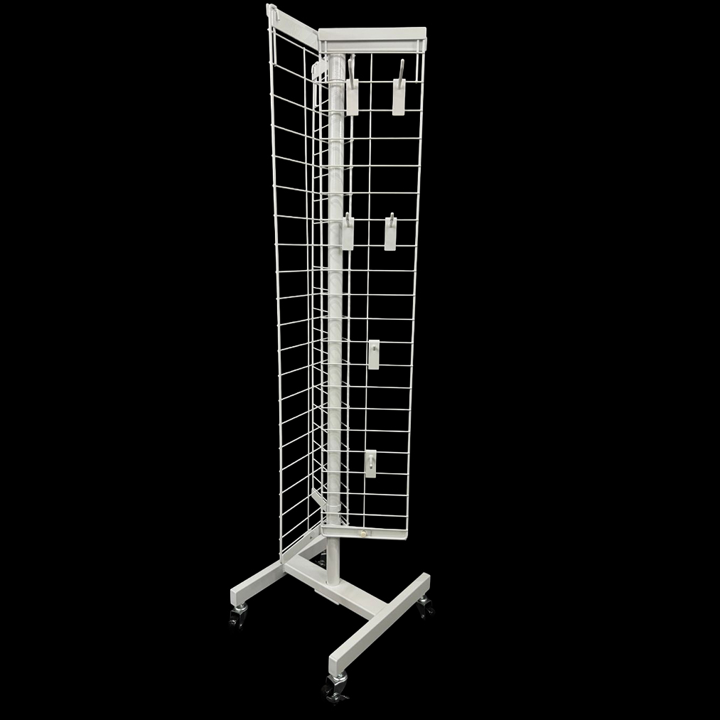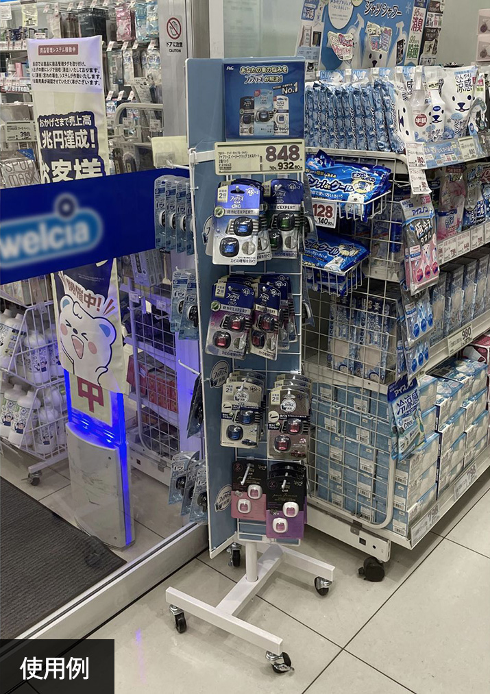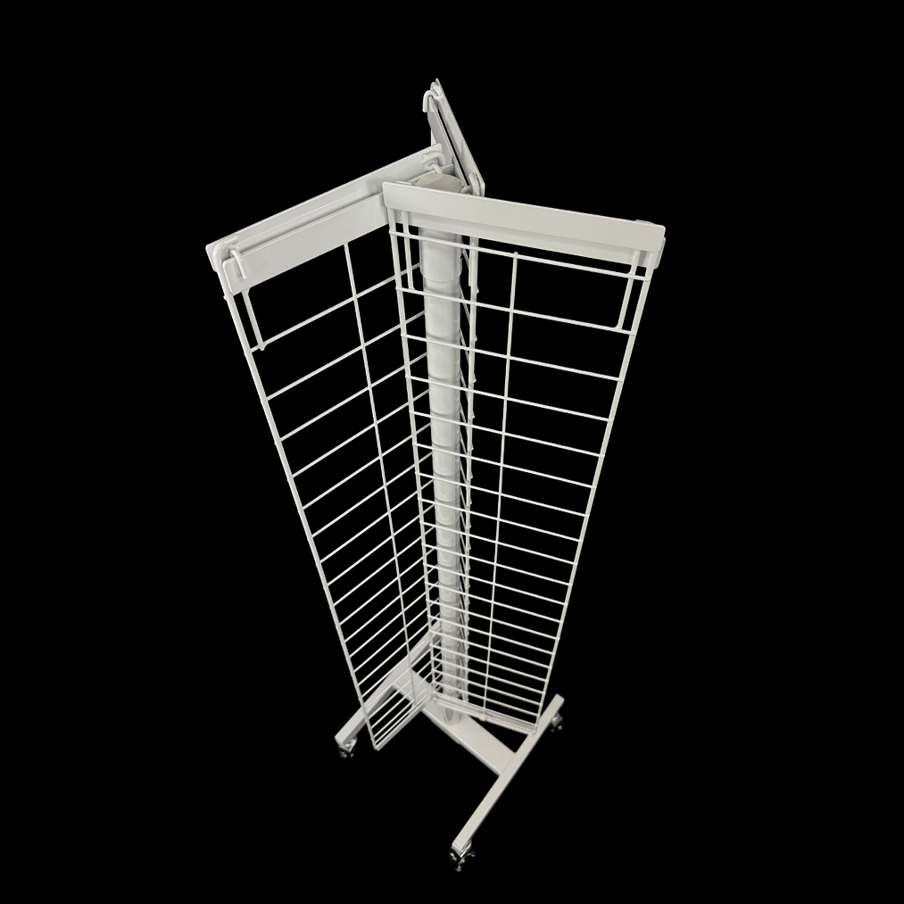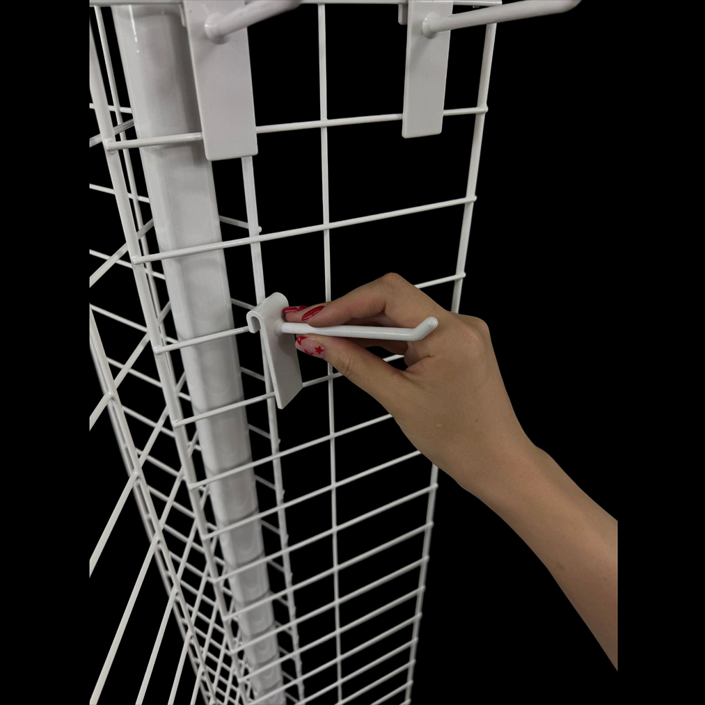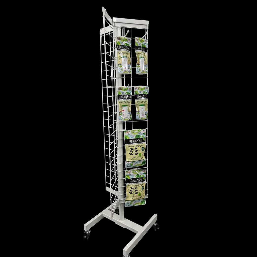 ネットが3面ついており省スペースで商品を陳列できる回転什器です。フックやカゴを引っ掛けた時に什器の外に飛び出しません。